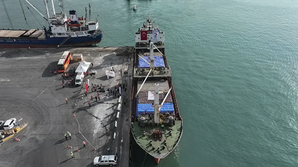 Bu kapsamda Türk Kızılay tarafından hazırlanan ve içerisinde gıda ve battaniye malzemeleri ağırlıklı yaklaşık 800 ton temel insani yardım malzemesinin yer aldığı "İyilik Gemisi"nin uğurlanması için Mersin Uluslararası Limanı'nda tören düzenlendi.