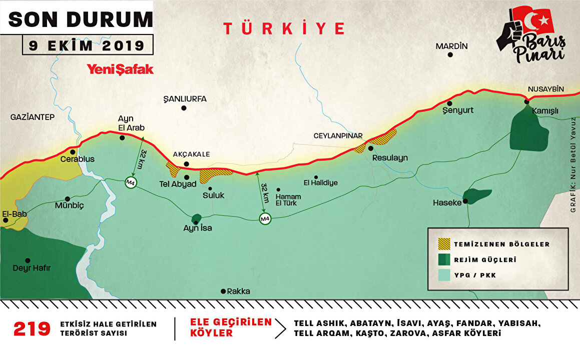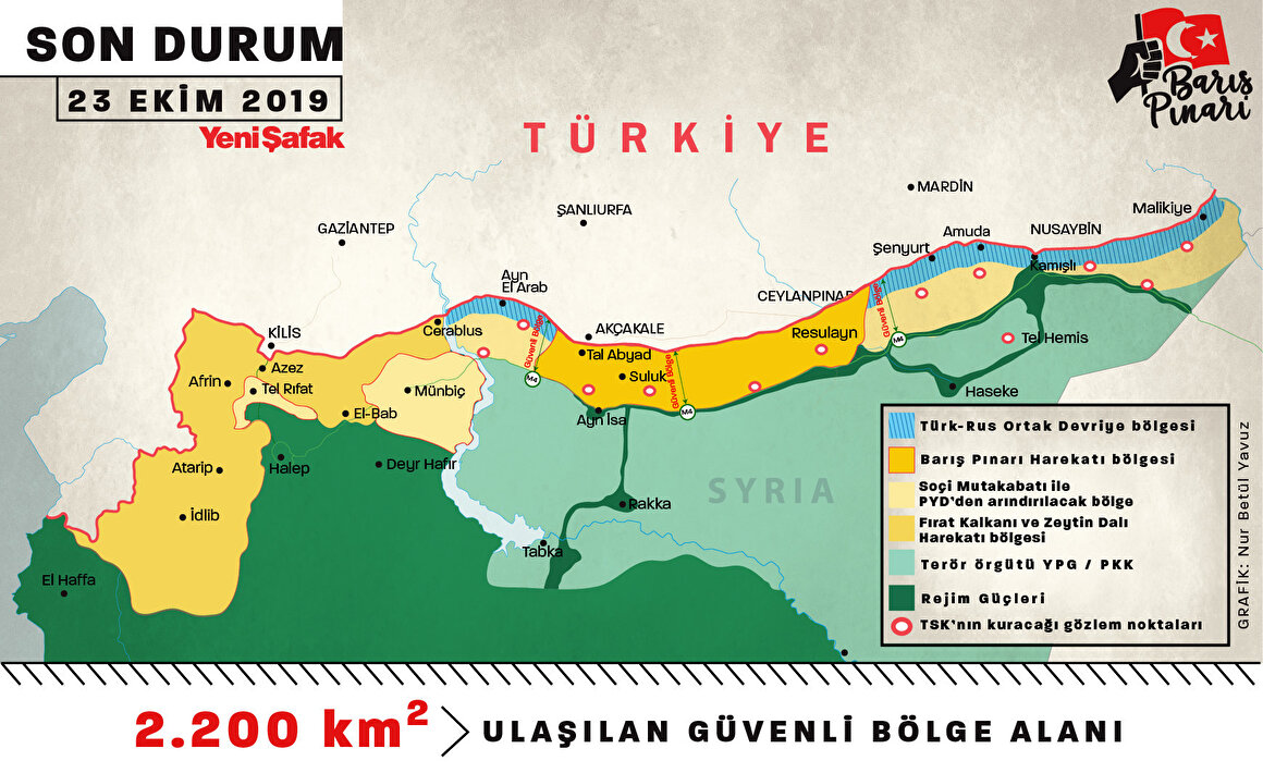 Türkiye Barış Pınarı Harekatına başladığı 9 Ekim’den sonra ABD ile 17 Ekim'de ve Rusya'yla 22 Ekim'de imzaladığı mutabakatlarda YPG'nin Suriye’deki terör koridoru planı boşa çıkarıldı. ABD ile varılan mutabakatla, Barış Pınarı Harekâtı'nın yürütüldüğü Ras'ul Ayn-Tel Abyad arasındaki