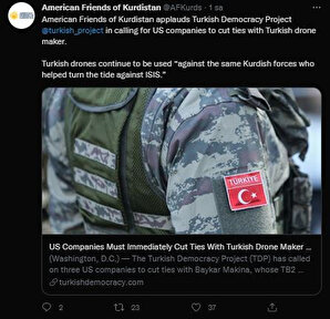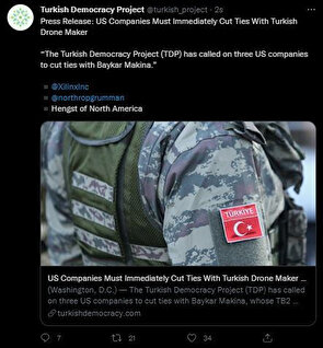 ABD'de, Türkiye karşıtı eski siyasetçiler ve Fetullahçı Terör Örgütü (FETÖ) üyeleri tarafından ortaklaşa kurulan 'Türkiye Demokrasi Projesi' isimli dernek, silahlı insansız hava araçlarıyla (SİHA) askeri operasyonlarda adından söz ettiren BAYKAR Savunma'yı hedef aldı. SİHA'ların 'DEAŞ ile mücadele eden PKK'ya karşı' kullanıldığının altının çizildiği duyuruda, "ABD şirketleri BAYKAR ile bağlarını kesmeli" denildi.
