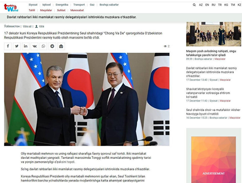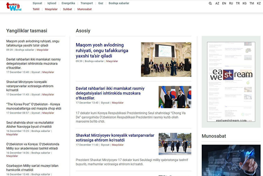 Türk Dünyası Ortak Medya Platformu’na Özbekistan’ın da katılmasıyla proje Azerbaycan, Türkiye, Kırgız, Türkmen, Kazak, Özbek Türkçeleriyle birlikte Rusça ve İngilizce de olmakla sekiz dilde devam ediyor.