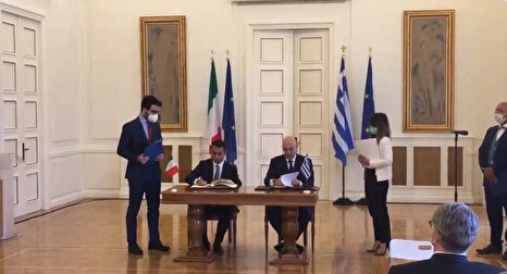 Yunanistan Dışişleri Bakanlığında, Yunanistan Dışişleri Bakanı Nikos Dendias ve İtalya Dışişleri Bakanı Luigi Di Maio tarafından imzalanan anlaşma sonrasında basın toplantısı düzenlendi.