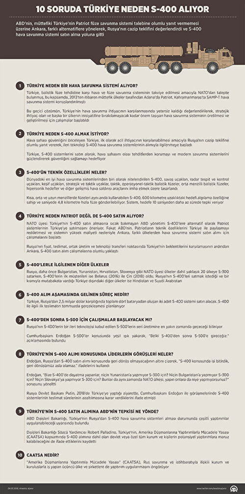 ABD'nin, müttefiki Türkiye'nin Patriot füze savunma sistemi talebine olumlu yanıt vermemesi üzerine Ankara, farklı alternatiflere yönelerek, Rusya'nın cazip teklifini değerlendirdi ve S-400 hava savunma sistemini satın alma kararı verdi. Birinci grup malzemelerinin Mürted Hava Meydanı'na teslim edilen ve günümüzün en önemli askeri teknolojilerin başında gelen S-400 sistemiyle Türkiye, hava sahasını olası tehditlerden korumayı ve modern savunma sistemlerini güçlendirerek güvenliğini tesis edecek.