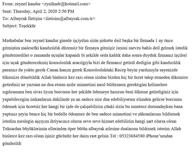 Türkiye'ye iner inmez Albayrak Grubu'na duygu yüklü bir teşekkür maili atan Kandur, özetle şu ifadeleri kullandı: