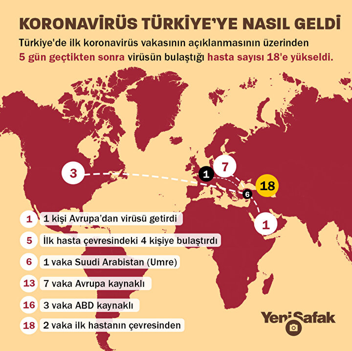 Türkiye'de ilk koronavirüs vakasının açıklanmasının üzerinden 5 gün geçtikten sonra virüsün bulaştığı hasta sayısı 18'e yükseldi. Sağlık Bakanı Koca'nın Pazar gecesi açıkladığı 12 yeni vakanın 7'sinin Avrupa'dan ve 3'ünün de Amerika'dan giriş yaptığı tespit edildi. İki vakanın da virüsü yine Avrupa'dan Türkiye'ye taşıyan hastanın çevresindeki kişiler olduğu açıklandı. Bu kişinin virüsü bulaştırdığı hasta sayısı böylece 6'ya çıktı. Bir vaka da umre için gittiği Suudi Arabistan'dan dönen vatandaşta tespit edildi. Vaka sayılarının kaynağı ve bulaşma verileri koronavirüsün Türkiye'ye taşınmasında en büyük rolü Avrupa'dan gelenlerin oluşturduğunu gözler önüne seriyor.