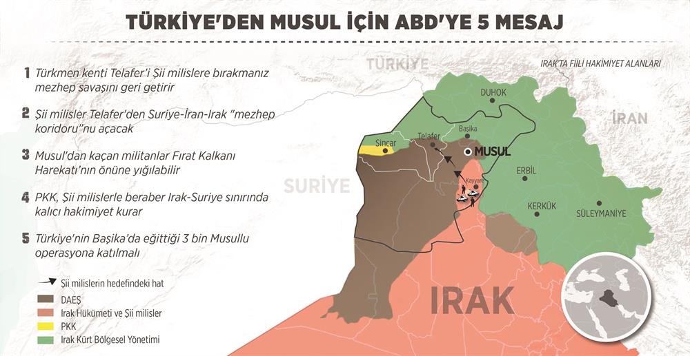 ABD tarafı ile görüşmelerde 'Musul Musullularındır' vurgusunu yapmayı sürdüren Türk yetkililer, şehri kurtarma operasyonuna Başika'daki topçu birliklerinin destek vermeye hazır olduğunu bildirdi.