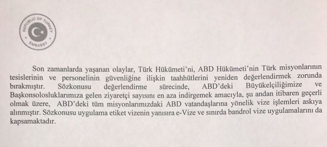 Türkiye, ABD vatandaşlarının vize başvurusunu askıya aldı. Vize kararını Türkiye'nin Washington Büyükelçiliği açıkladı. Sınırda vize ve e-vize uygulaması da askıya alınıyor.