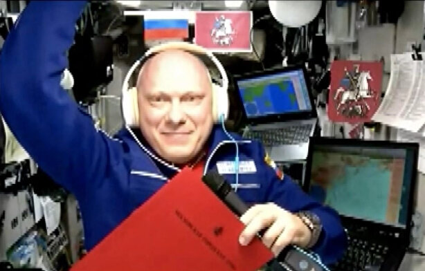 Aynı zamanda meclis üyesi olan Artemiev canlı bağlantı sırasında Rusya bayrağını yansıtan koyu mavi renkte uzay kıyafeti giydiği görüldü.