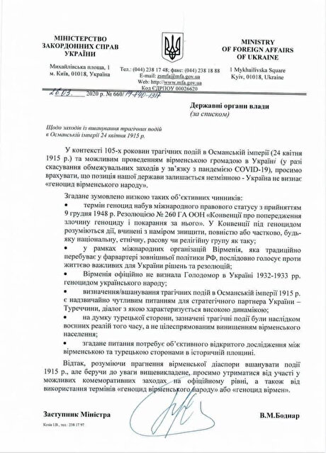 Ukrayna'nın yayınladığı duyuru ile herhangi bir resmi yetkilinin Türkiye'yi "soykırım" ve benzeri ifadelerle suçlamaması talimatı verildi. ABD Senatosu, Aralık ayında 1915 Ermeni olaylarını sözde "soykırım" olarak tanıyan bir karar tasarısını kabul etmişti. Senatonun bu konudaki görüşünü yansıtan bir düzenleme olan karar tasarısının, yasal olarak herhangi bir bağlayıcılığı bulunmuyor.
