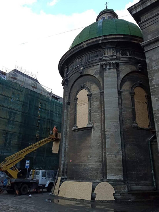 Şehrin en önemli tarihi ve dini yapılarından biri olan Latin Katedralini, Rus saldırısına karşı koruyabilmek için önlemler alınıyor.