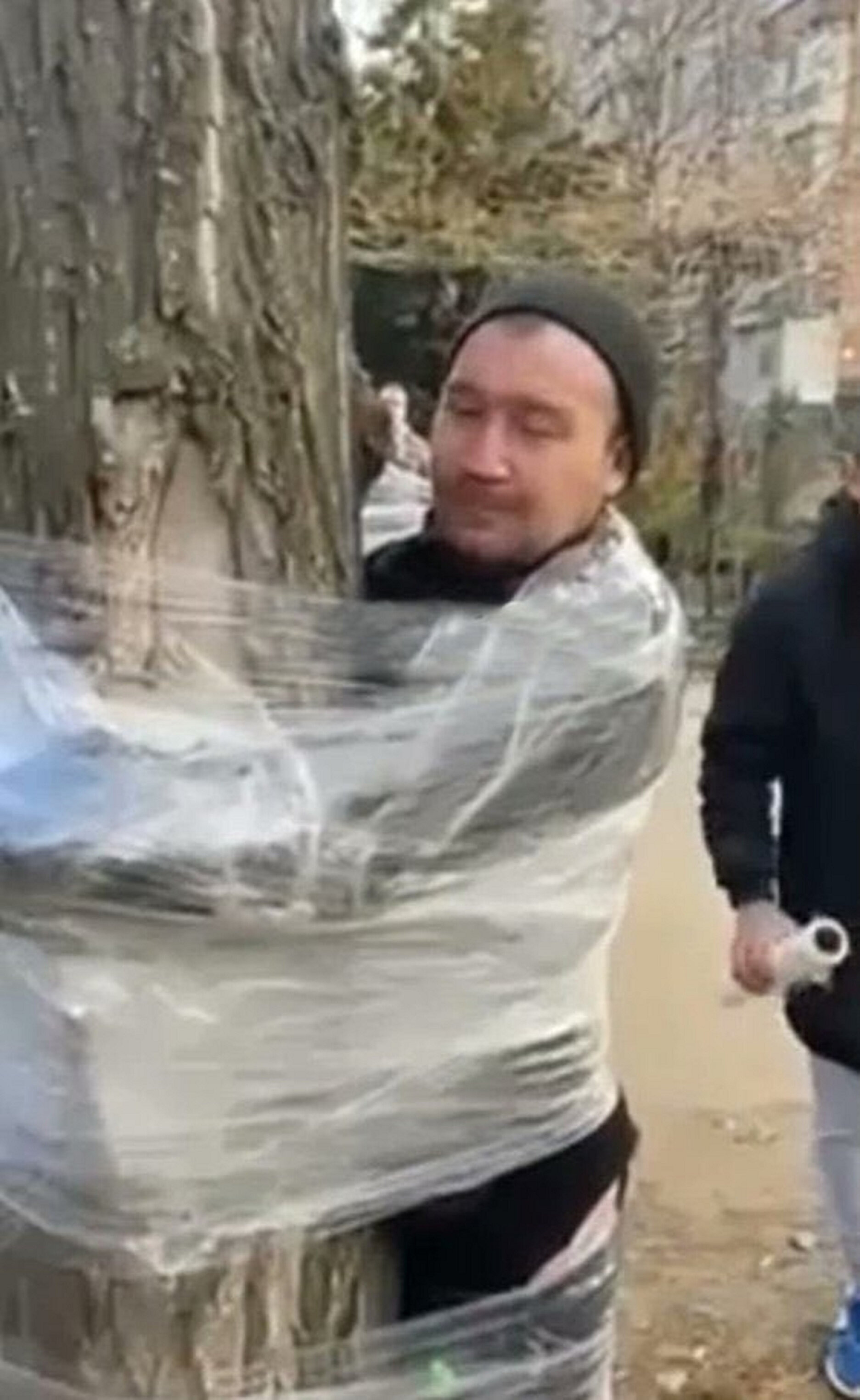 Ukrayna'nın Nikolayev şehrinde yakalanan ve yağmacı olduğu iddia edilen Rusya vatandaşı, Ukraynalılar tarafından streç film yardımıyla ağaca bağlandı.