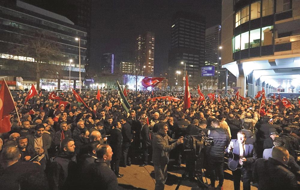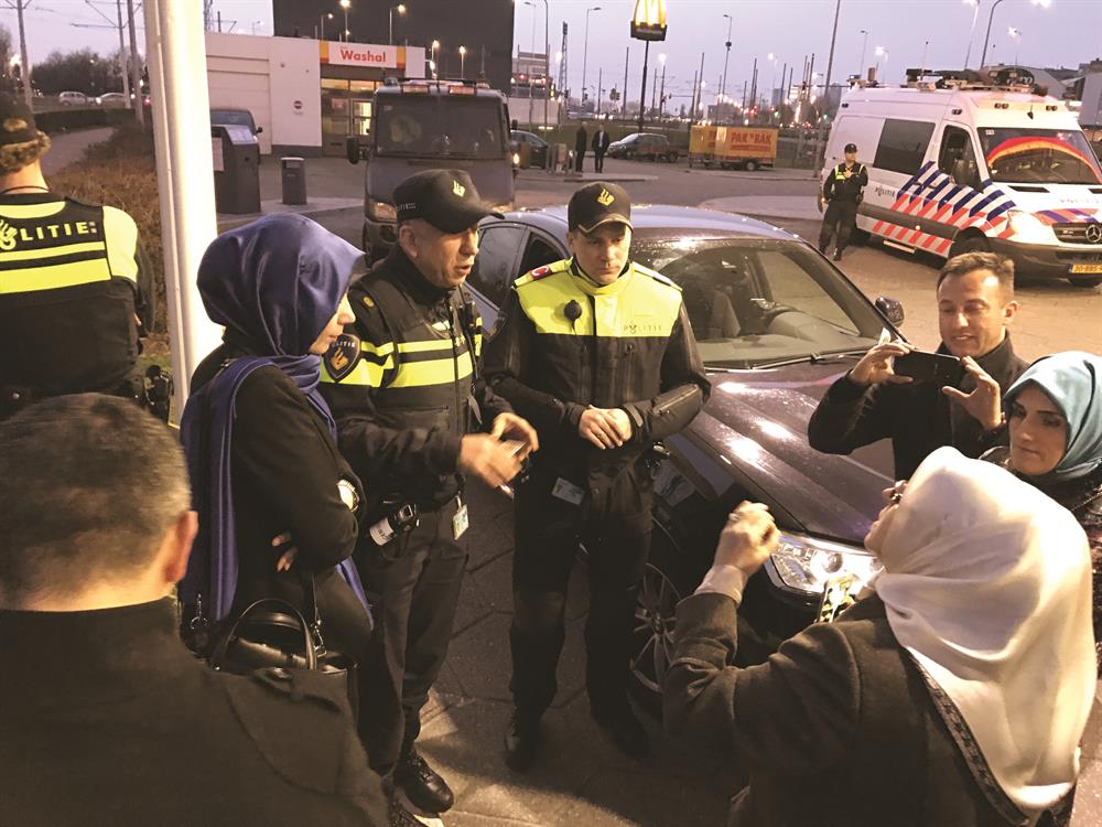 Hollanda uluslararası hukuku ve diplomatik gelenekleri hiçe sayıp eşkıyalığa soyundu. Önce Dışişleri Bakanı Çavuşoğlu'nun uçağının iniş iznini iptal eden faşist hükümet, Bakan Fatma Betül Sayan Kaya’nın Türkiye toprağı sayılan elçilik binasına girmesini de polis zoruyla engelledi. Bunlarla yetinmeyen ırkçılar, Türkiye Başkonsolosu'nun elçilik binasından çıkışını yasakladı. Bakanı Kaya, bölgeden polis eskortuyla ayrıldı.