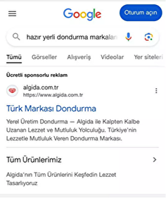 İşgalci İsrail destekçisi Unilever firmasının kuruluşlarından Algida, Google'a para vererek Türkiye'de çıkan arama sonuçlarında kendisini 'Türk Markası dondurma' ibaresiyle göstermişti.