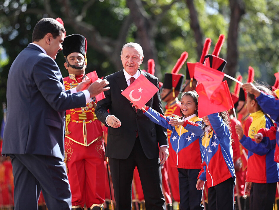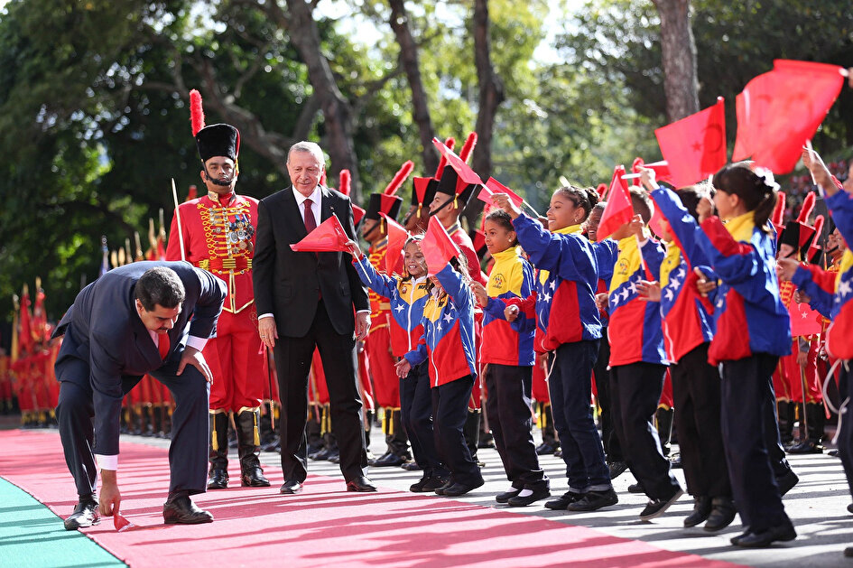 Cumhurbaşkanı Erdoğan, Venezuela Devlet Başkanı Maduro tarafından resmi törenle karşılandı. Törende Venezuelalı askerler, İstiklal Marşı'nı hep bir ağızdan okudu. Maduro da karşılama töreni sırasında rüzgar nedeniyle çocuklarından elinden düşen Türk Bayrağını yerden kaldırdı. Bağımsız ülkeler hattında Türkiye'nin lider olduğunu belirten Maduro, "Türkiye, Avrasya bölgesinde lider. Türkiye, dünyayı tekrar uyandırdı" şeklinde konuştu.