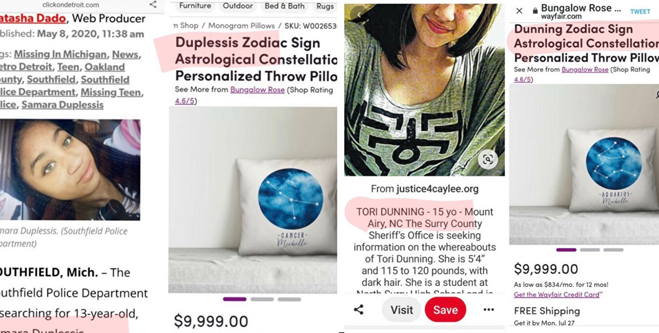 Wayfair alışveriş sitesinin şüpheleri üzerine çeken ilanlardan biri 1 dolarlık yastık için 45 bin dolar, iki adet duvar tablosu için 99 bin dolar talep edilmesi.. Bu ürünlere verilen kodların arama motorları üzerinden araştırıldığında yine küçük kız çocuklarına dair fotoğraflara ulaşılıyor.