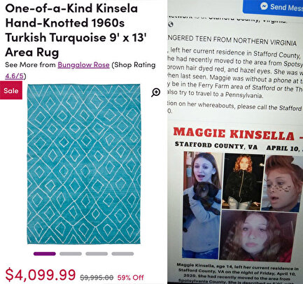 Wayfair'de bir başka ilanın konusunda yine kayıp çocuk var. 4 bin dolardan satışa çıkarılan el yapımı Türk halısında geçtiğimiz aylarda Virginia'da kaybolan 14 yaşındaki Maggie Kinsela'nın adı yer alıyor.