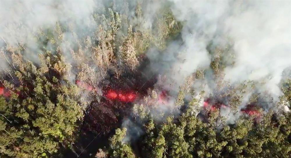 - İnsansız hava aracıyla çekilen görüntülerde, bölgedeki bir yolda oluşan çatlaktan lav püskürdüğü ve yakınlardaki ormanlık alandan aktığı görülüyor.