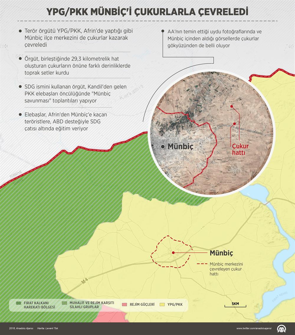 Terör örgütü YPG/PKK, Afrin'de yaptığı gibi Münbiç ilçe merkezini de çukurlar kazarak çevreledi. Örgüt, birleştiğinde 29,3 kilometrelik hat oluşturan çukurların önüne farklı derinliklerde toprak setler kurdu. SDG ismini kullanan örgüt, Kandil'den gelen PKK elebaşları öncülüğünde 'Münbiç savunması' toplantıları yapıyor. Elebaşlar, Afrin'den Münbiç'e kaçan teröristlere, ABD desteğiyle SDG çatısı altında eğitim veriyor.