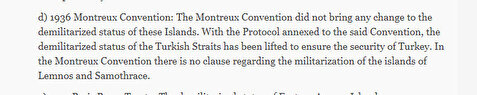 Montrö Boğazlar Sözleşmesi'nin ise isminden dikkat edileceği üzere adaların konumu ile ilgili bir maddesi bulunmaz. Sözleşme, Türkiye'nin Boğazlardaki egemenlik haklarıyla ilgiliyken Yunanistan Dışişleri'nin apaçık bir yalanı argüman olarak kullanması ülkenin diğer tezlerinin de yalan üzerinden şekillendiğine delil niteliğinde.