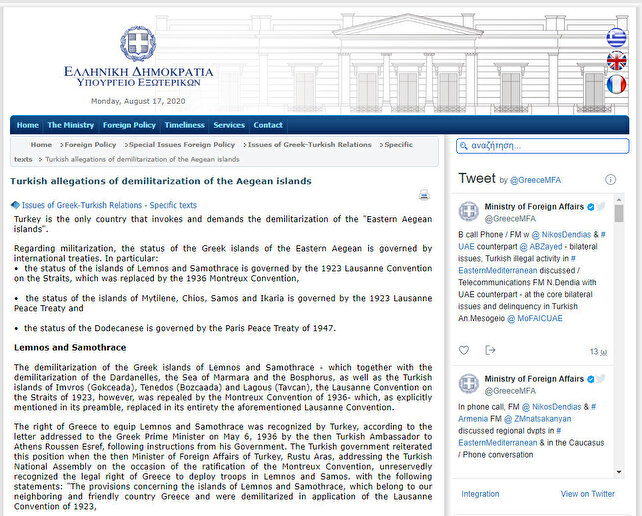 Yunanistan Dışişleri Bakanlığı kanalıyla apaçık bir yalan söylemekten, var olan antlaşmalara olmayan maddeler eklemekten çekinmiyor. Montrö Boğazlar Sözleşmesi’nde adalar ile ilgili tek bir madde dahi bulunmazken bu adaların statükosunu belirleyen antlaşma hala Lozan Barış Antlaşması.
