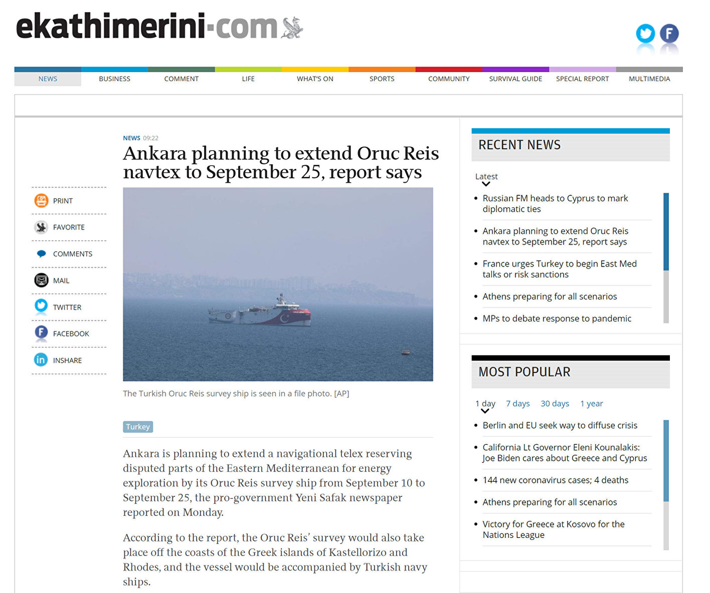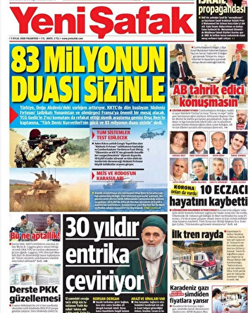 Bugün Yeni Şafak'ın manşetinde yer alan '83 milyonun duası sizinle' haberi Yunan basınında geniş yankı buldu. Türkiye'nin sismik araştırma faaliyetleri kapsamında Oruç Reis'in görev süresini 25 Eylül'e kadar uzatacağı bilgisini Yeni Şafak'tan öğrenen Yunan basını, "Türkiye'nin çalışmaları Rodos karasularına kadar dayanacak" manşetini attı. Oruç Reis'in faaliyetleri için ilan edilen Navtex'in süresi 10 Eylül'de sona eriyordu.