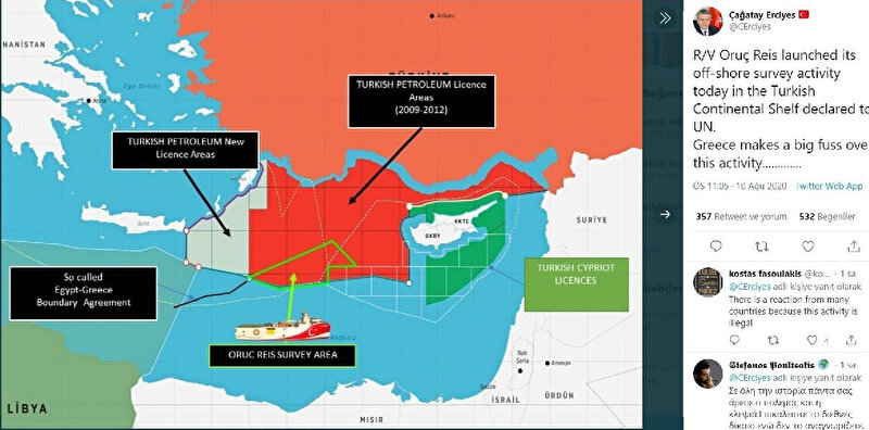 Dışişleri Bakanlığı İkili Siyasi İşler ve Denizcilik-Havacılık-Hudut Genel Müdürü Büyükelçi Çağatay Erciyes, Twitter hesabından yaptığı paylaşımda, Oruç Reis'in faaliyet yürüttüğü bölgeyi gösteren haritaya yer verdi. Bölgede gerilim yaratanın maksimalist talepleriyle Yunanistan olduğunu belirten Erciyes paylaşımında, Türkiye’nin hukuki tezlerini özetledi.