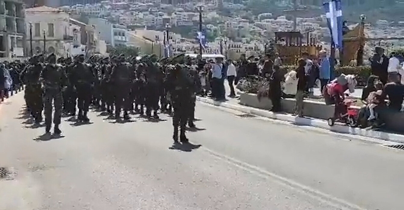 Adaya çıkartılan Yunan komando birlikleri askeri geçit töreni düzenledi.