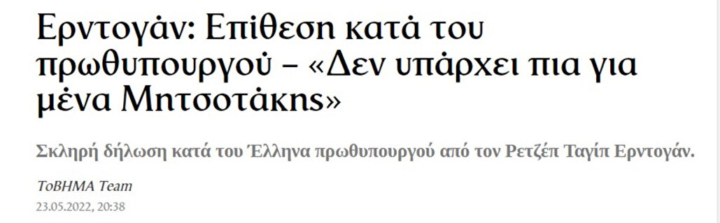 Bir başka Yunan gazetesi To Vima'nın başlığı 'Erdoğan'dan aşırı saldırı: Artık benim için Miçotakis yok' oldu. Gazete, Türkiye liderinin Yunanistan Başbakanı'na karşı zehir zemberek açıklamalar yaptığını belirtti.