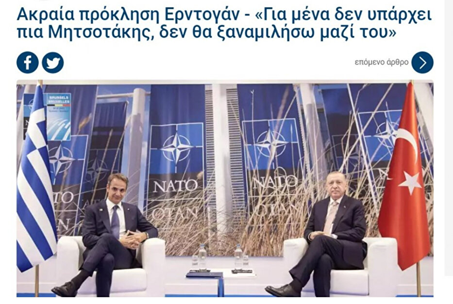 Yunan Ethnos gazetesi de gelişmeyi, "Erdoğan'dan büyük meydan okuma: "'Benim için Miçotakis artık yok, onunla bir daha konuşmayacağım'" ifadeleriyle okuyucularına duyurdu.