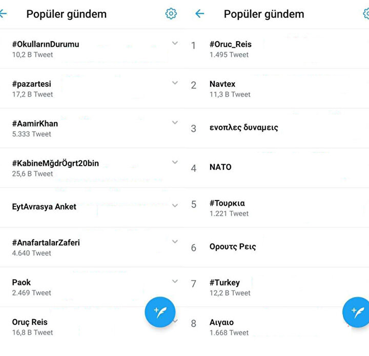 - Yunanistan gündeminde sırasıyla; Oruç Reis, Navtex, NATO, Türkiye, Oruç Reis, Türkiye, Ege Denizi konuşulurken Türkiye gündeminde, Oruç Reis kendine sekizinci sıradan yer buldu.
