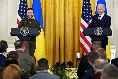 Rusya'nın ülkesine savaş başlattığı 24 Şubat'tan bu yana ilk yurt dışı ziyaretini yapan Ukrayna Devlet Başkanı Zelenskiy ile ABD Başkanı Biden, Beyaz Saray'daki ikili görüşmelerinin ardından ortak basın toplantısı düzenledi.