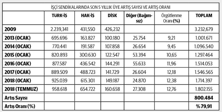 Uzun yıllardır azalan sendikalı sayısı 5 yıldır düzenli bir artış trendine girmiştir. İşçilerde örgütlenme oranı ise son 5 yılda düzenli bir biçimde artmasına rağmen yeterli değil. Örgütlenme oranı 2013 Ocak ayında yüzde 9,21’den, 2018 Temmuz ayında yüzde 12,38’e çıkmıştır. Son beş yılda örgütlenme oranı 3 puan artmasına rağmen halen yüzde 12’ler seviyesindedir. Bir başka anlatımla her 100 işçiden sadece 12’si sendikalıdır.