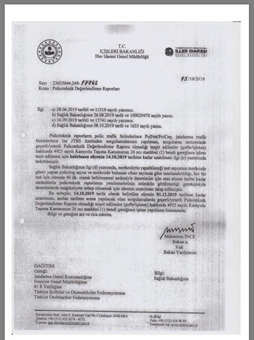1 Ocak 2019 itibariyle bu zamana kadar Psikoteknik Muayene ve Değerlendirme Raporu için Türkiye'nin çeşitli illerinde yapılan başvurular sonrasında testlere tabi tutulan 305 bin şoförden 45 binin bu testlerden geçemediğini aktardı.