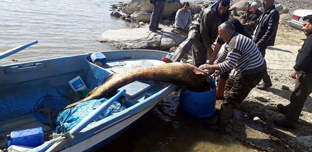 Manisa’nın Salihli ve Köprübaşı ilçeleri arasında bulunan Demirköprü Baraj Gölü’nde balıkçılar tarafından dev yayın balığı yakalandı. 2.5 metre uzunluğunda ve 100 kilogramlık yayın balığını şaşkınlığa neden oldu.