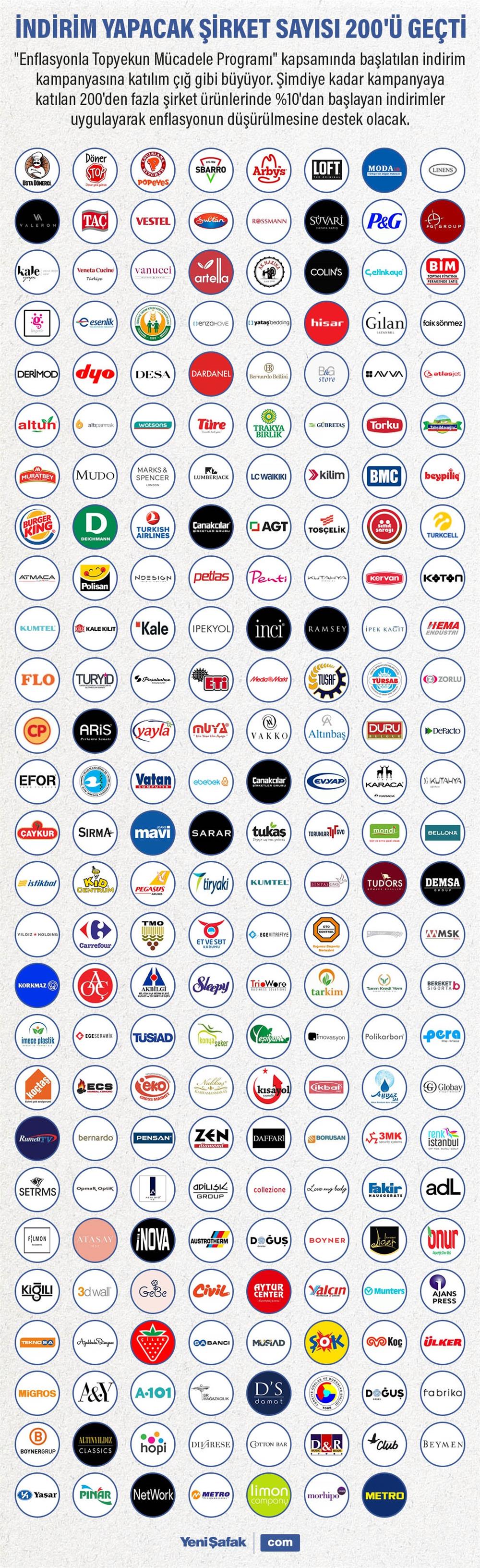 "Enflasyonla Topyekun Mücadele Programı" kapsamında başlatılan indirim kampanyasına destek büyüyor. Koç, Sabancı, Doğuş Grubu gibi Türkiye'nin öncü kuruluşlarının da destek verdiği kampanyaya katılan kurum ve kuruluşların sayısı 200'ü aştı.