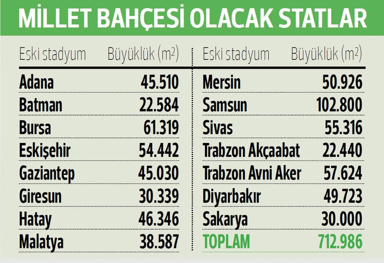 Ülke genelinde eski 15 stadyum arazisi Cumhurbaşkanı Recep Tayyip Erdoğan’ın çağrısı ile Millet Bahçesi’ne dönüşüyor.