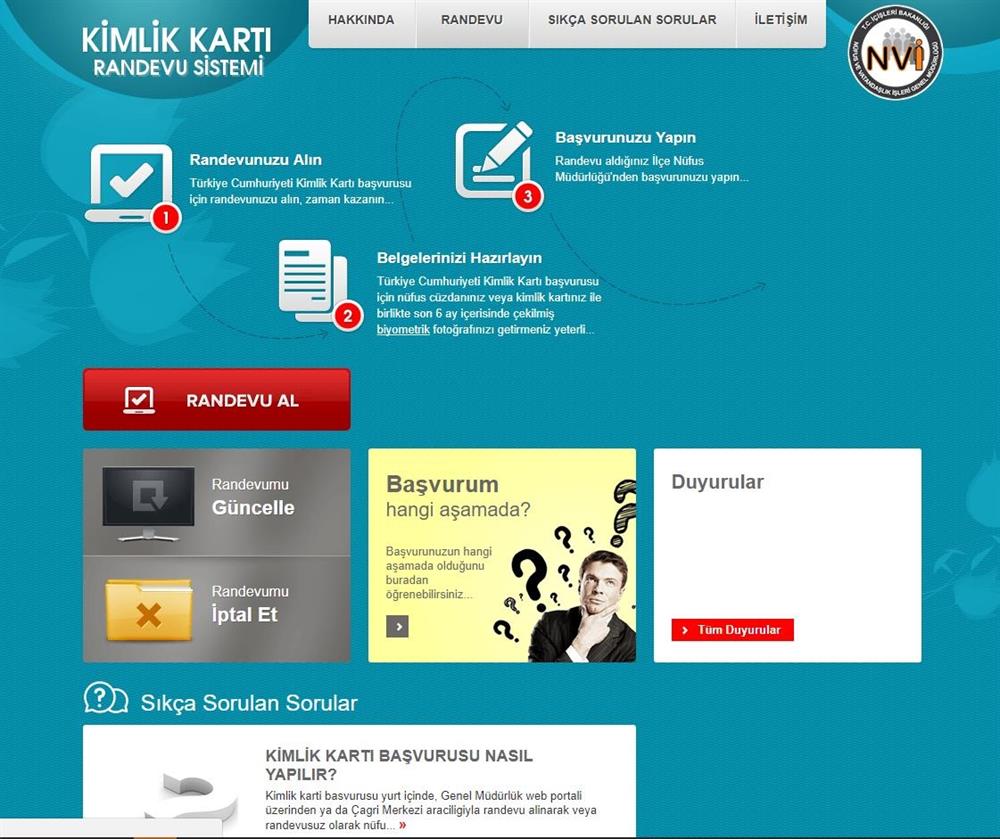 "https://ekimlikrandevu.nvi.gov.tr" internet sitesinden ve "Alo 199" çağrı merkezinden randevu alınarak veya randevusuz ilçe nüfus müdürlüklerine, yurt dışında ise dış temsilciliklere gidilerek alınabilen kimlik kartına vatandaşlar yoğun ilgi gösterdi.
