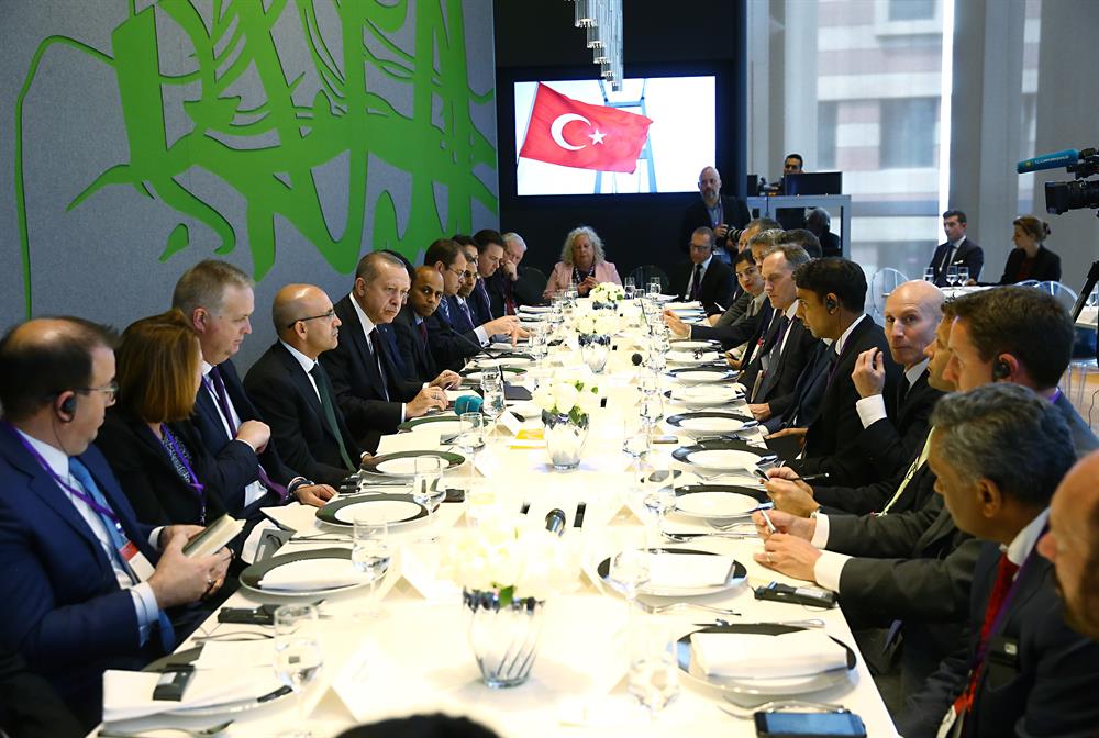 Cumhurbaşkanı Recep Tayyip Erdoğan, Londra'da küresel piyasalara yön veren 18 trilyon doları yöneten dev yatırımcılarla bir araya geldi. Bloomberg merkezindeki yuvarlak masa toplantısına aralarında Citigroup, Credit Suisse, Deutsche Bank, Goldman Sachs, JP Morgan, Morgan Stanley, Rabobank, BlackRock International, Bluebay Asset Management, Fidelity International'ın da olduğu 25 firma ve fonu temsil eden üst düzey yönetici katıldı. Yemekli toplantıda Başbakan Yardımcısı Mehmet Şimşek, Ekonomi Bakanı Nihat Zeybekci ve Yatırım Ajansı Başkanı Arda Ermut da hazır bulundu.