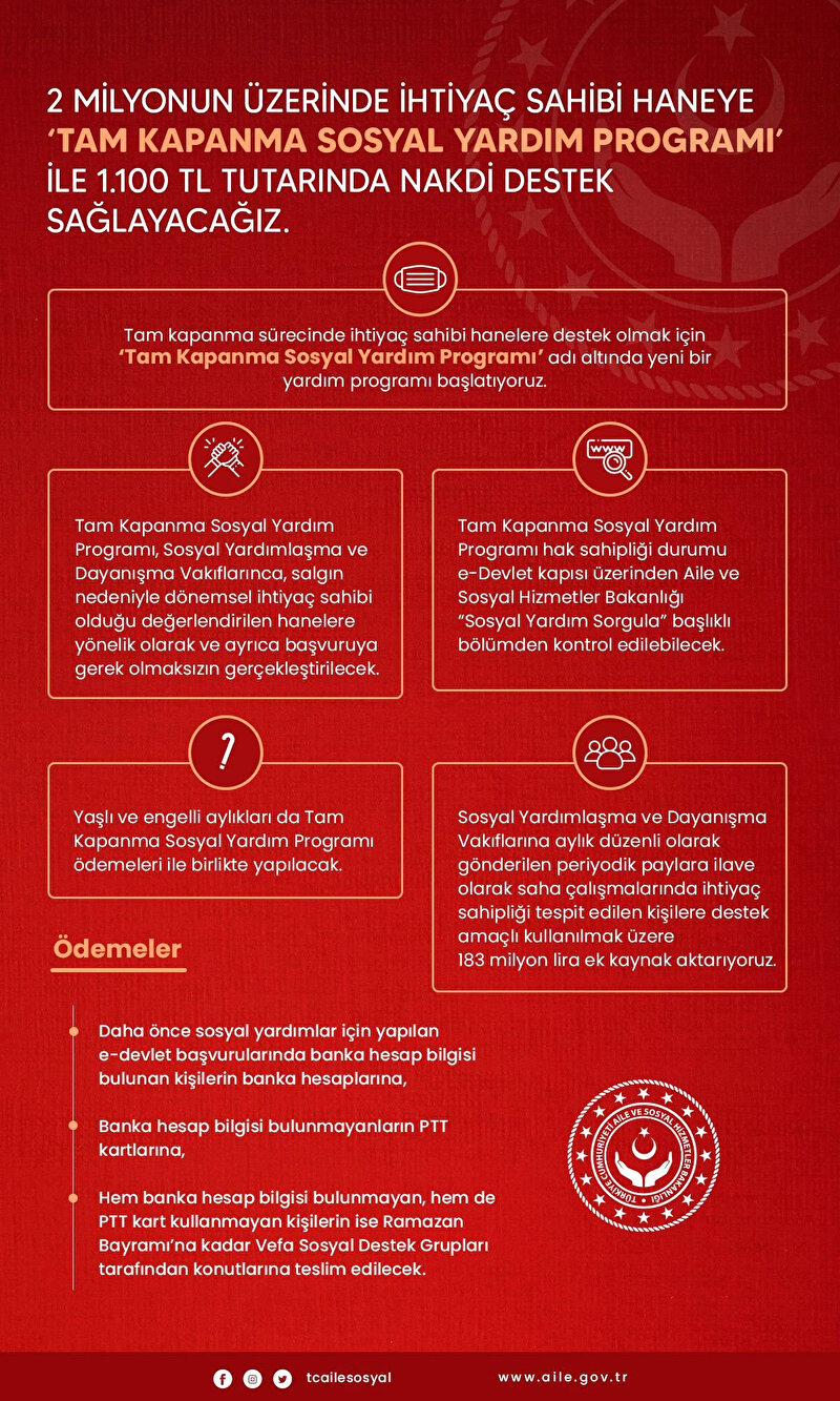 "Salgın sürecinde işçimizden sanayicimize, esnafımızdan çiftçimize kadar her kesimi destekledik. Şimdi de; 'Tam Kapanma Sosyal Yardım Programıyla' 2 milyonun üzerinde haneye toplamda 2 milyar TL'yi aşan nakdi destek sağlıyoruz"
