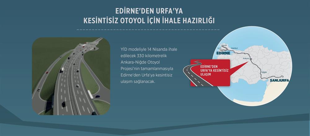 YİD modeliyle 14 Nisan'da ihale edilecek Ankara-Niğde Otoyol Projesi, 330 kilometrelik otoyolun yapılmasıyla Edirne'den Şanlıurfa'ya kesintisiz ulaşım sağlanacak. Toros Dağları'ndan geçen Tarsus-Niğde kesimi ve Ulukışla bağlantı yolu trafiğe açıldı. Kırkgeçit Tünel ve Viyadük grubunun da parçası olan otoyolun tamamlanmamış kısmının, YİD modeliyle gerçekleştirilmesi planlanıyor.