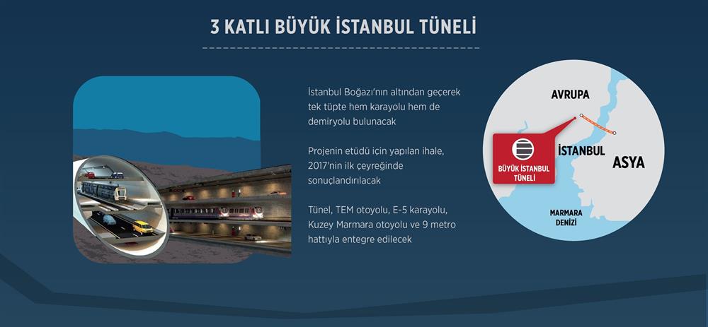 Ulaştırma, Denizcilik ve Haberleşme Bakanlığı Altyapı Yatırımları Genel Müdürlüğünce 3 katlı Büyük İstanbul Tüneli Projesi'nde ön yeterlilik alan 6 firma, 15 Şubat'ta mali ve teknik tekliflerini sunacak. 2017 yılında tamamlanması planlanan projenin etüt, proje ve mühendislik hizmetleri kapsamında, karada ve denizde derin sondaj çalışmaları yapılarak, zemin verileri belirlenecek. İhale sürecinin ardından 1 yıl içinde mühendislik projelerinin tamamlanması planlanıyor.