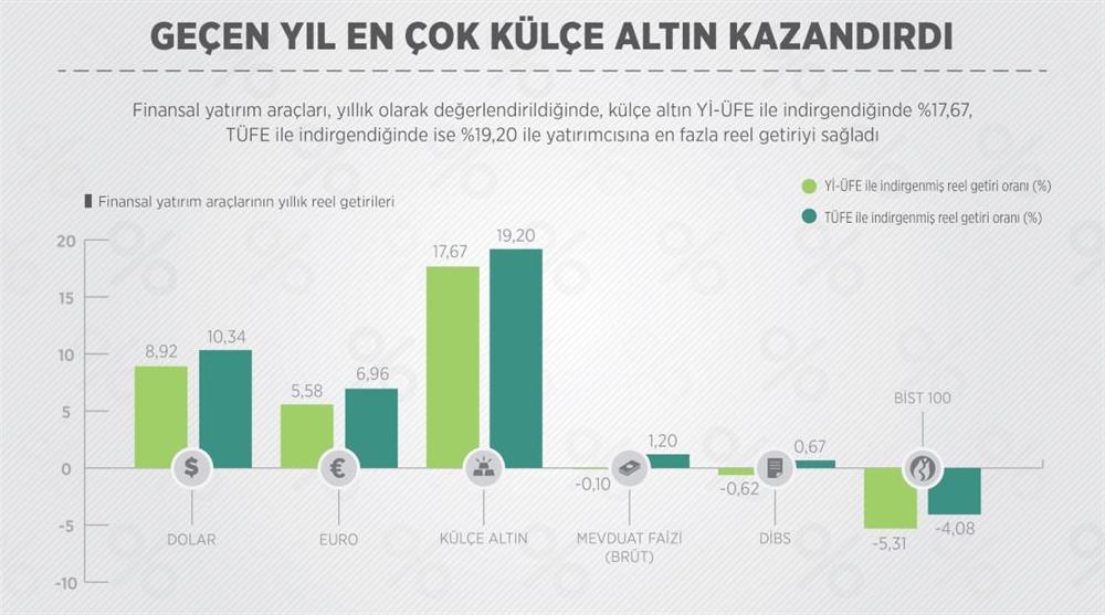 Tüketici Fiyatları Endeksi (TÜFE) ve Yurt İçi Üretici Fiyat Endeksi (Yİ-ÜFE) ile indirgendiğinde geçen ay en fazla reel getiri 2016 yılında külçe altından elde edildi.