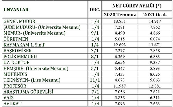 Bu artışlar neticesinde 2021 yılı ocak dönemi itibarıyla bazı kamu görevlilerinin net görev aylığı şöyle: