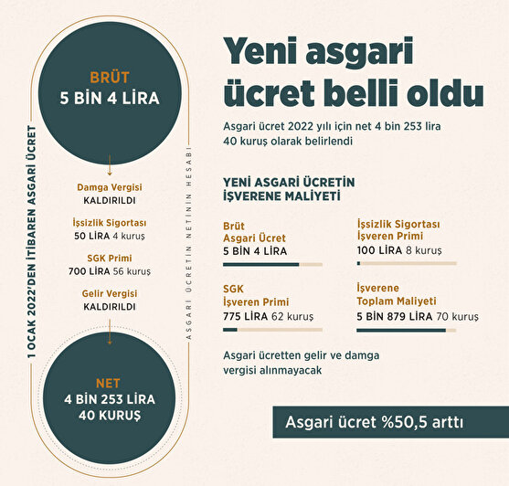 2022 yılı asgari ücret brüt 5 bin 4 TL, işverene maliyeti ise 5 bin 879 TL oldu. Yıl başından itibaren asgari ücretten alınan gelir vergisi ve damga vergisi da kaldırıldı.