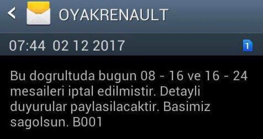 Gönderilen mesajda, "Bu gece servislerimizden birinin geçirdiği trafik kazasında acı kayıplarımız ve yaralanan arkadaşlarımız olmuştur. Bu doğrultuda 08 - 16 ve 16 - 24 mesaileri iptal edilmiştir. Detaylı duyurulular paylaşılacaktır. Başımız sağ olsun" ifadeleri kullanıldı.