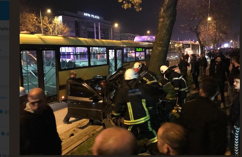 İşçi servisine çarpan 16 SJT 66 plakalı siyah araç da kontrolden çıkarak yaya yolunda bulunan ağaca saplandı. İşçi servisi ve altına aldığı araç yolda bir süre sürüklendikten sonra metro istasyonun duvarına çarparak durdu.