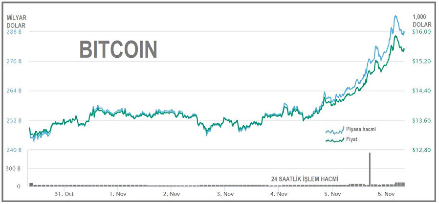 Kripto para piyasalarında hareketlilik devam ediyor. Küresel düzeyde merkez bankalarının dijital para çıkarma hazırlıklarını artırmalarıyla, kripto paraya yönelik ilgiyi artırınca, kripto piyasalarının en yüksek hacimli birimi Bitcoin 15,500 doları da aştı. Bitcoin, 15,848 dolar ile yaklaşık iki yılın zirvesini gördükten sonra, son 24 saatte yüzde 8.69 artışla 15,503 dolara yükseldi ve haftalık kazanımını yüzde 15.34 düzeyine taşıdı. Bitcoin'in piyasa hacmi de, son 24 saatte yaklaşık 23 milyar dolar artışla 287.35 milyar dolara kadar yükseldi.