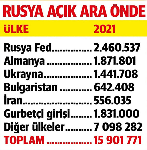 Türkiye, zorlu pandemi şartlarına rağmen, bu yılın ilk sekiz ayında 15 milyon 901 bin turist ağırladı. Ocak-ağustos döneminde Türkiye’ye giren ziyaretçilerin 14 milyon 70 bini yabancılar, 1 milyon 831’i ise yurt dışındaki vatandaşlardan oluştu. Türkiye’ye en çok turist gönderen ülkeler Rusya, Almanya, Ukrayna, Bulgaristan ve İran oldu.