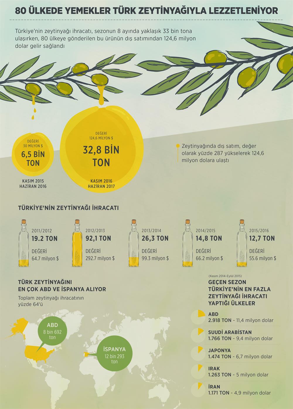 - Ege Zeytin ve Zeytinyağı İhracatçıları Birliğinden alınan bilgiye göre, 1 Kasım 2016'da başlayan zeytinyağı ihracat sezonunun 30 Haziran 2017 itibarıyla geride kalan 8 ayındaki dış satım, ihracatçıların yüzünü güldürdü.
