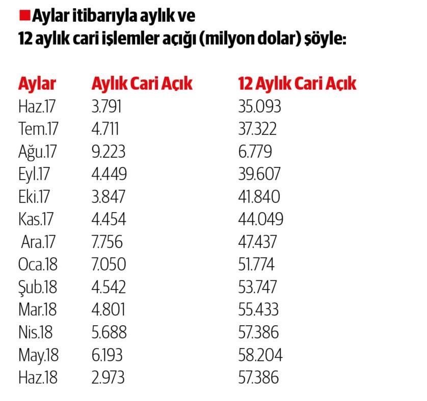 Cari işlemler açığı haziranda 2017’nin aynı ayına kıyasla 2 milyar 973 milyon dolara geriledi. Cari açık, son 9 yılın en düşük haziran ayı rakamı olarak kayıtlara geçti. 12 aylık cari açık da, 9 ayın ardından düşüşe geçerek 57 milyar 386 milyon dolara geriledi.