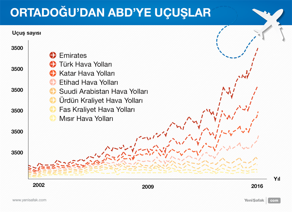 ABD'ye yapılan uçuşlardan ciddi oranda pay alan Türk Hava Yolları, Emirates ve Katar Havayolları'nın son yıllardaki başarısı sektöre ilişkin araştırmalarda da görülüyor. Official Airline Guide (OAG)'nin resmi istatistiklerine göre; ABD'deki çeşitli kentlere yapılan en uzun uçuşlar listesinde THY, Emirates ve Qatar Airways ilk 20 içinde bulunuyor.